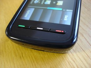 At the bottom of the screen there are three keys: a send key (green), a home key and an end key (red). The home key (the equivalent of the swirly S60 key) switches between the home screen and the application screen (or with a long press pops up the multi-tasking switcher). The inclusion of the send and end keys is a sensible addition - it allows you to quickly answer or end phone calls without looking at the screen, and, as with other S60 phones, they can also used for shortcuts in numerous places (e.g. activating the call log from the home screen, initiate calls in contacts and so on). At the top of the screen, next to the usual VGA video calling camera, is a proximity sensor which locks the screen (deactivates touch) when you hold the phone to your ear, which should prevent your cheek inadvertently ending calls or sending naughty text messages.